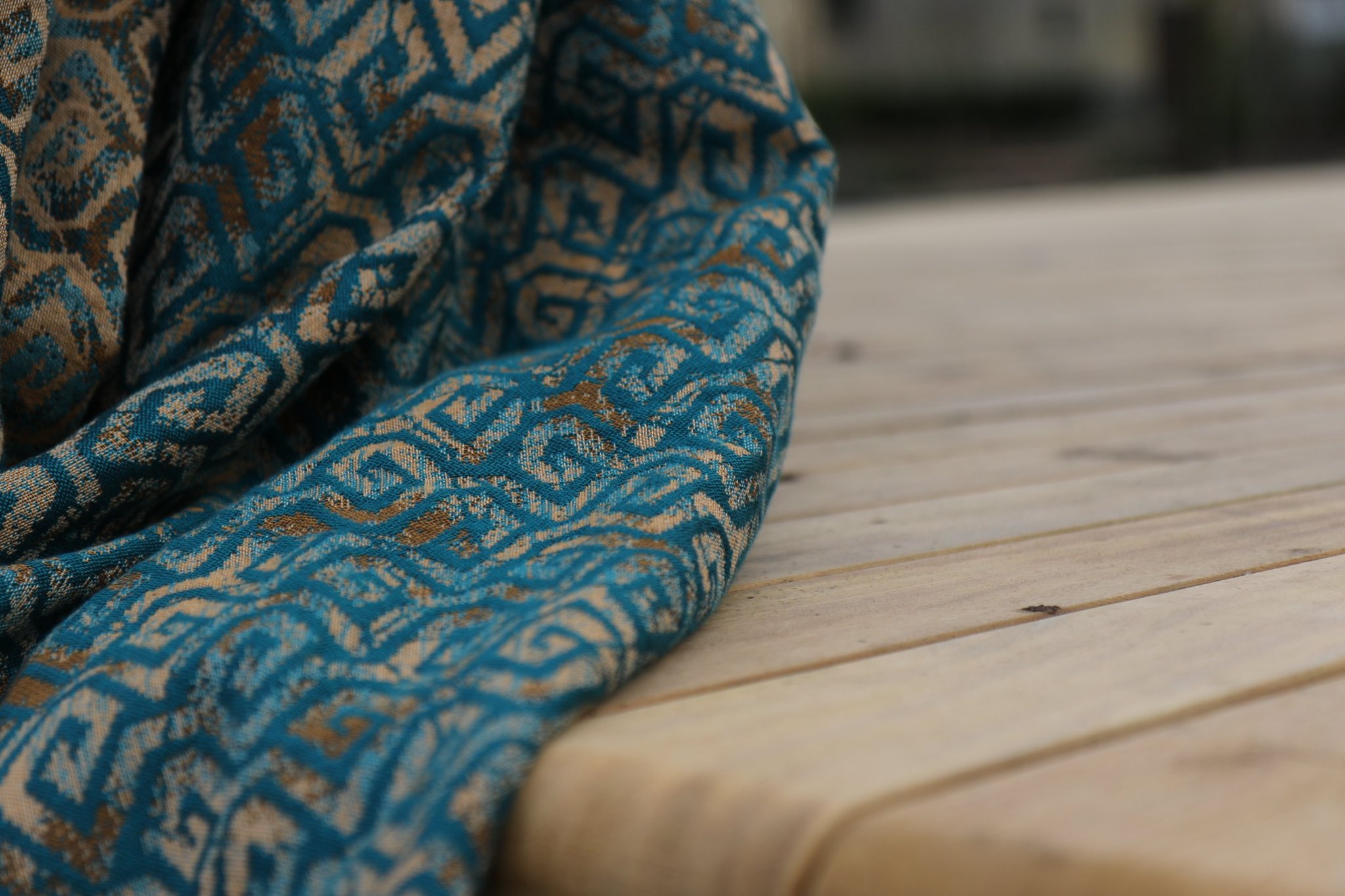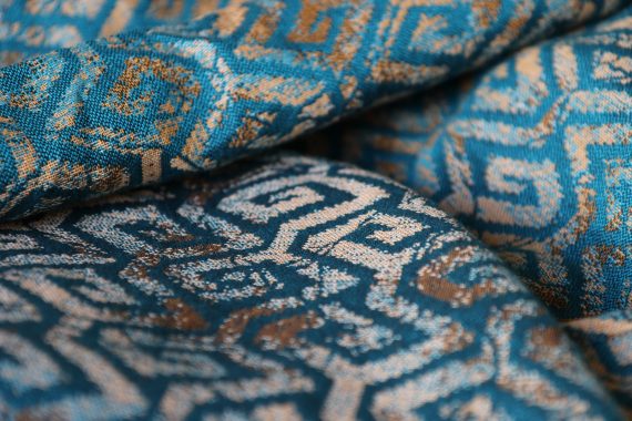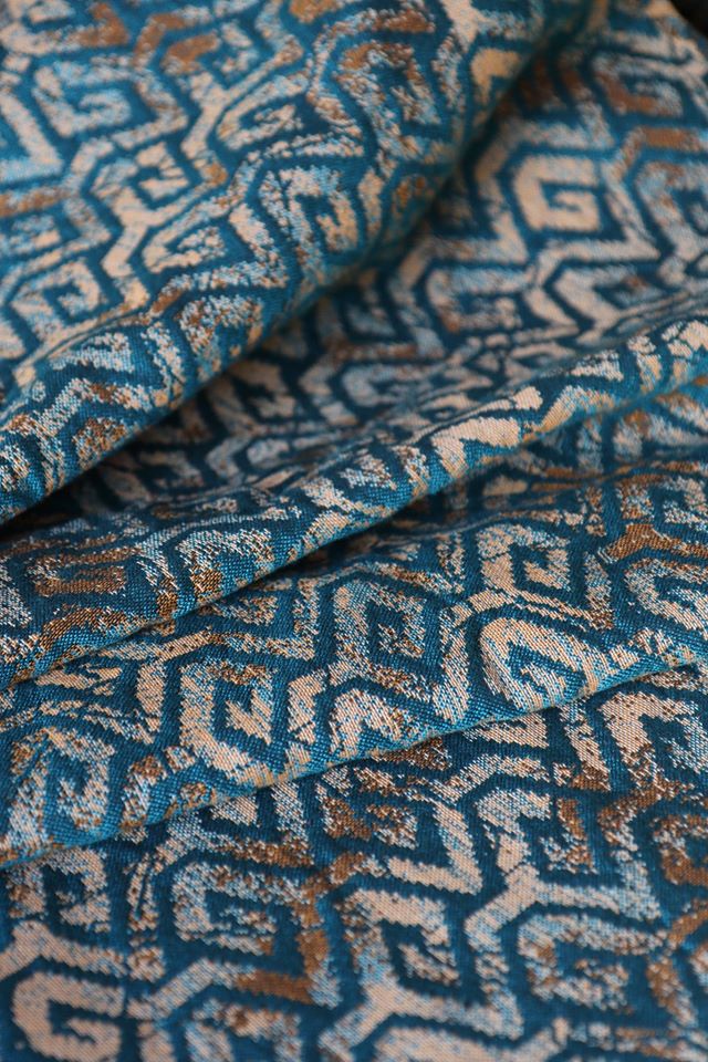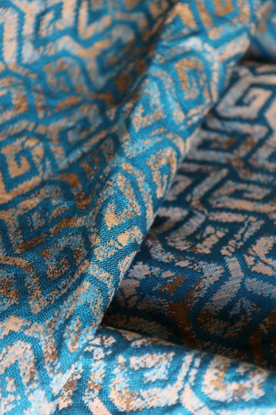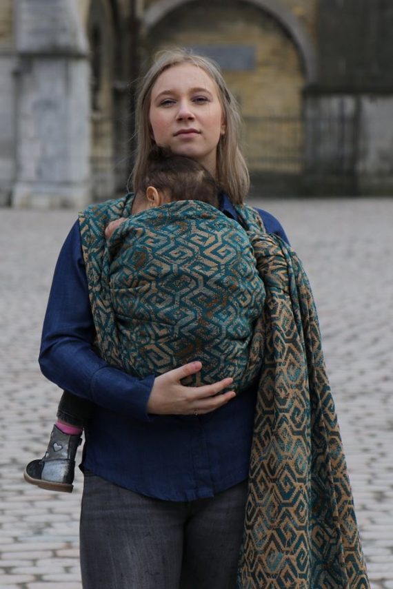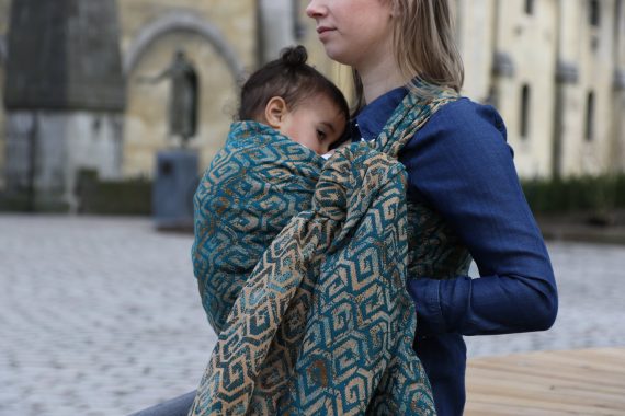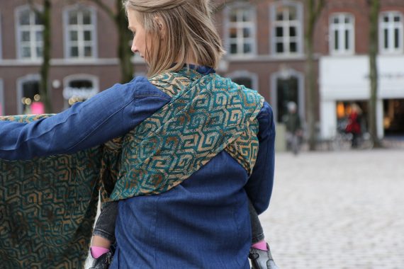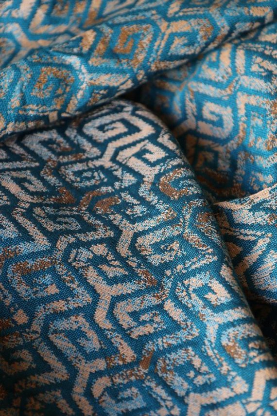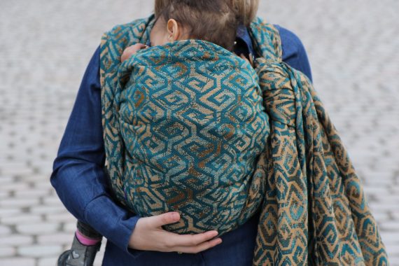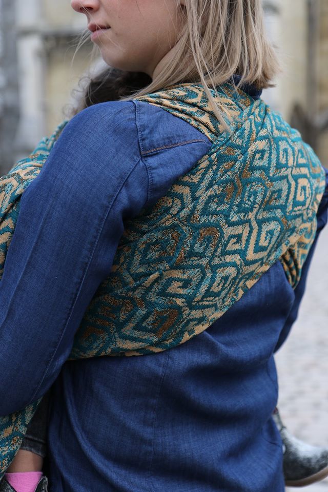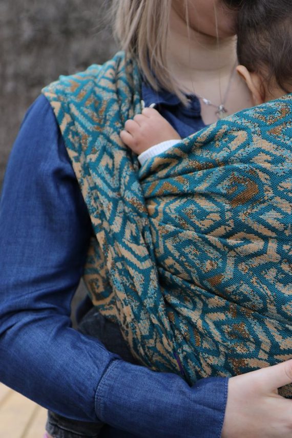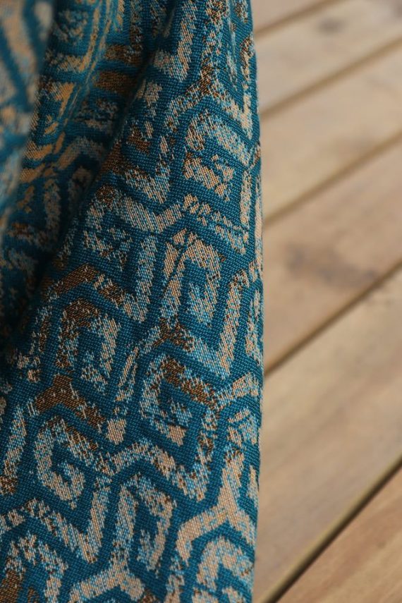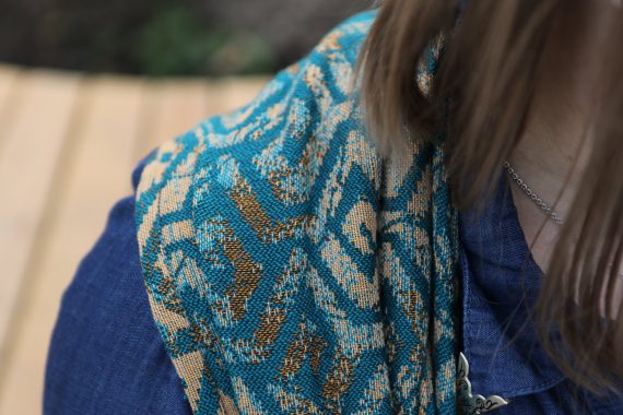 En ljuvligt mjuk sjal som samtidigt är stark med sin materialblandning av bomull och seacell. Nyanserna i sjalen går i ockra och blågrönt. Den har en fin glans och sjalas lätt med fint glid. Den kräver lite inbrytning innan den blir helt mjuk, men blir redan mjukare efter en första tvätt. Den fungerar från nyfödd, men passar även bra för större barn. Tyget känns lätt i handen, passar alla erfarenhetsnivåer.