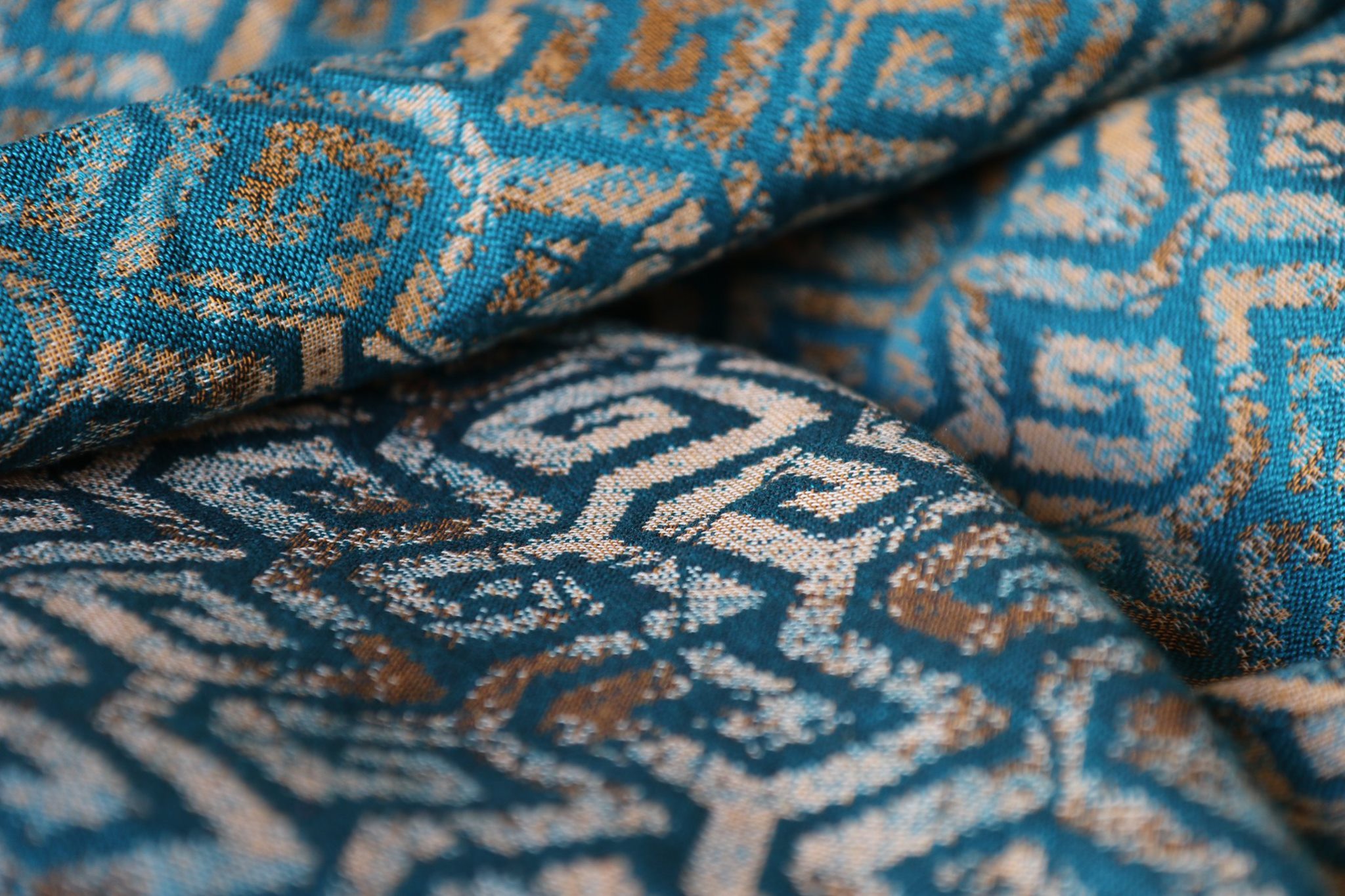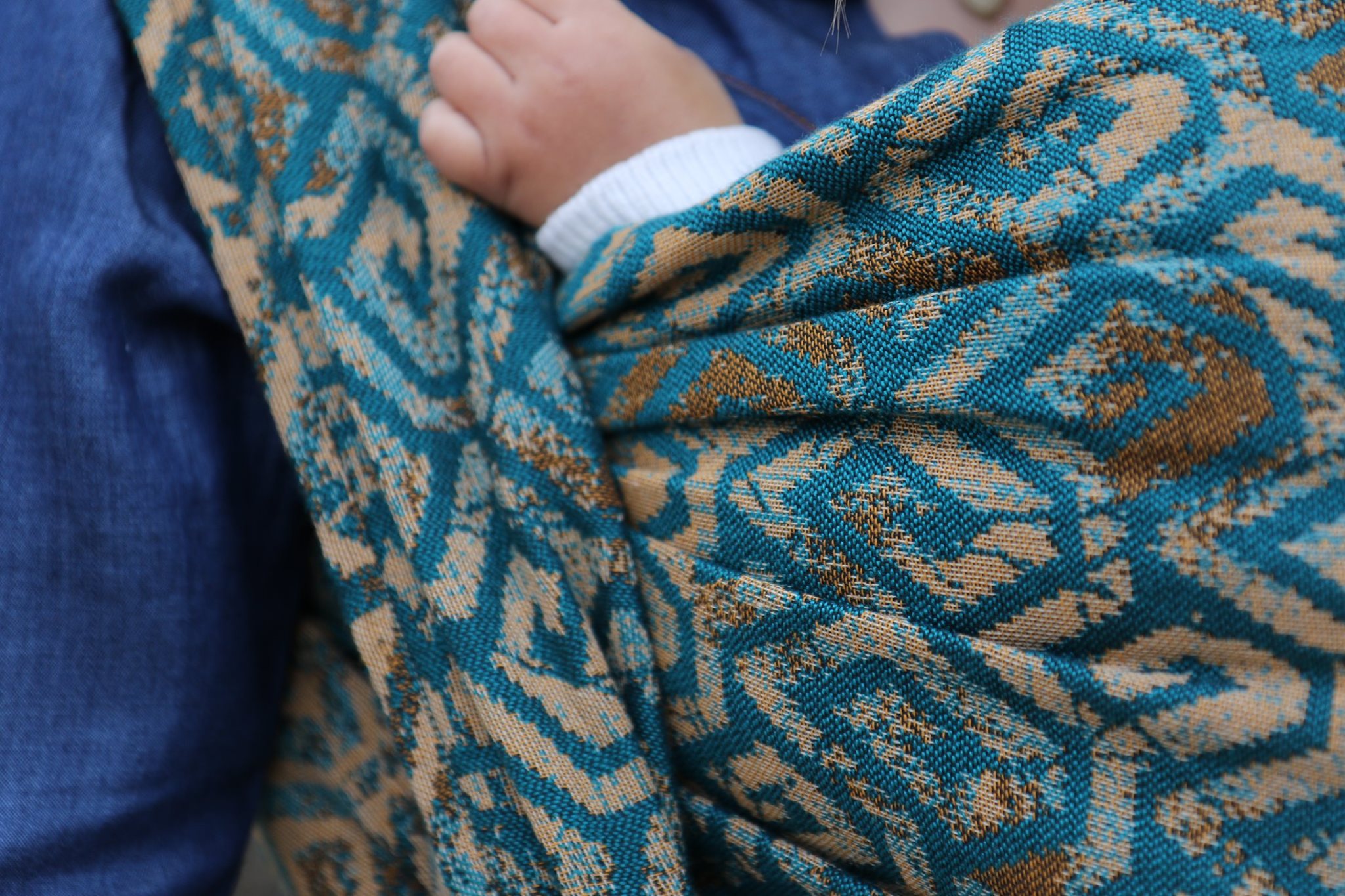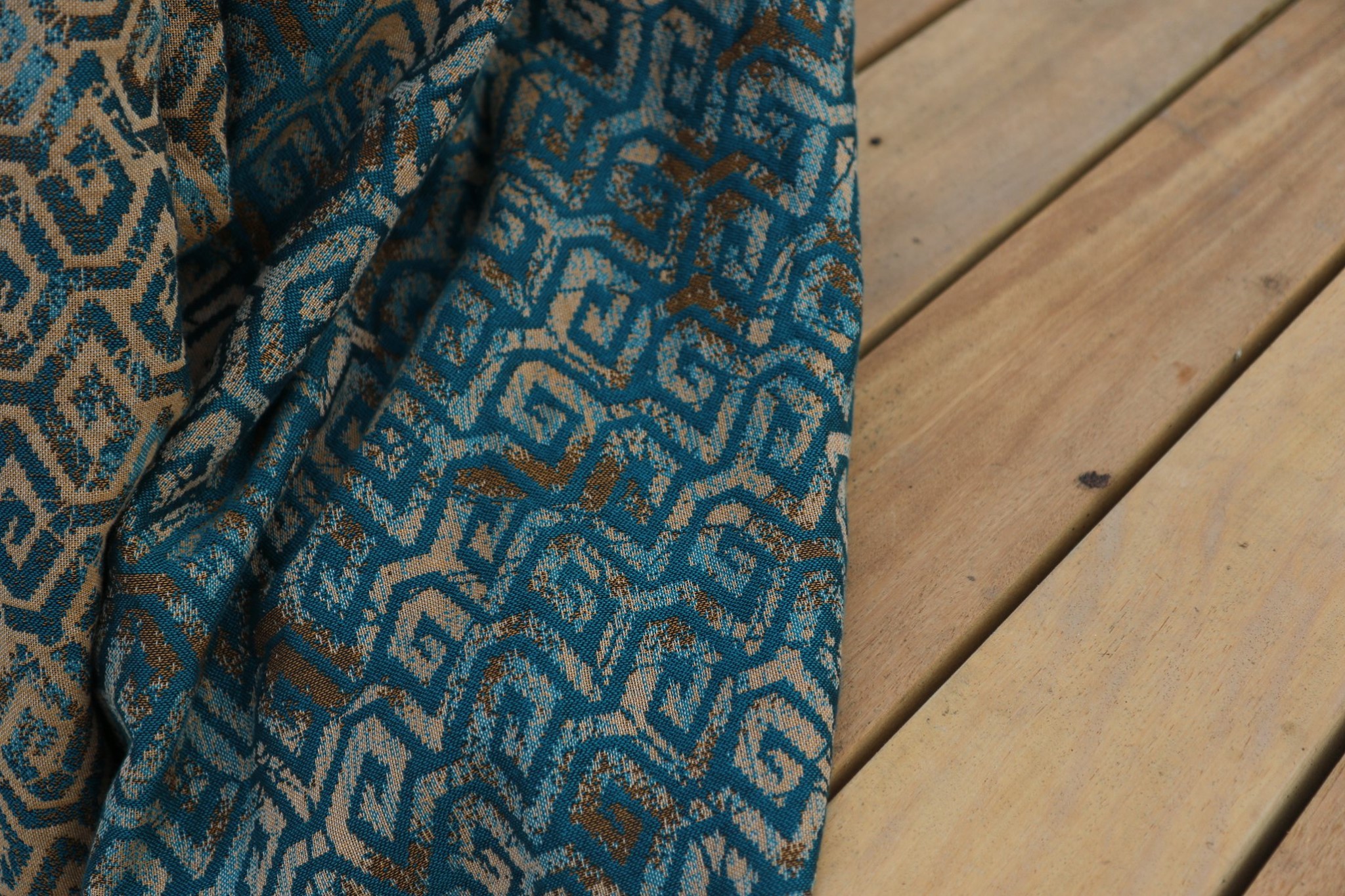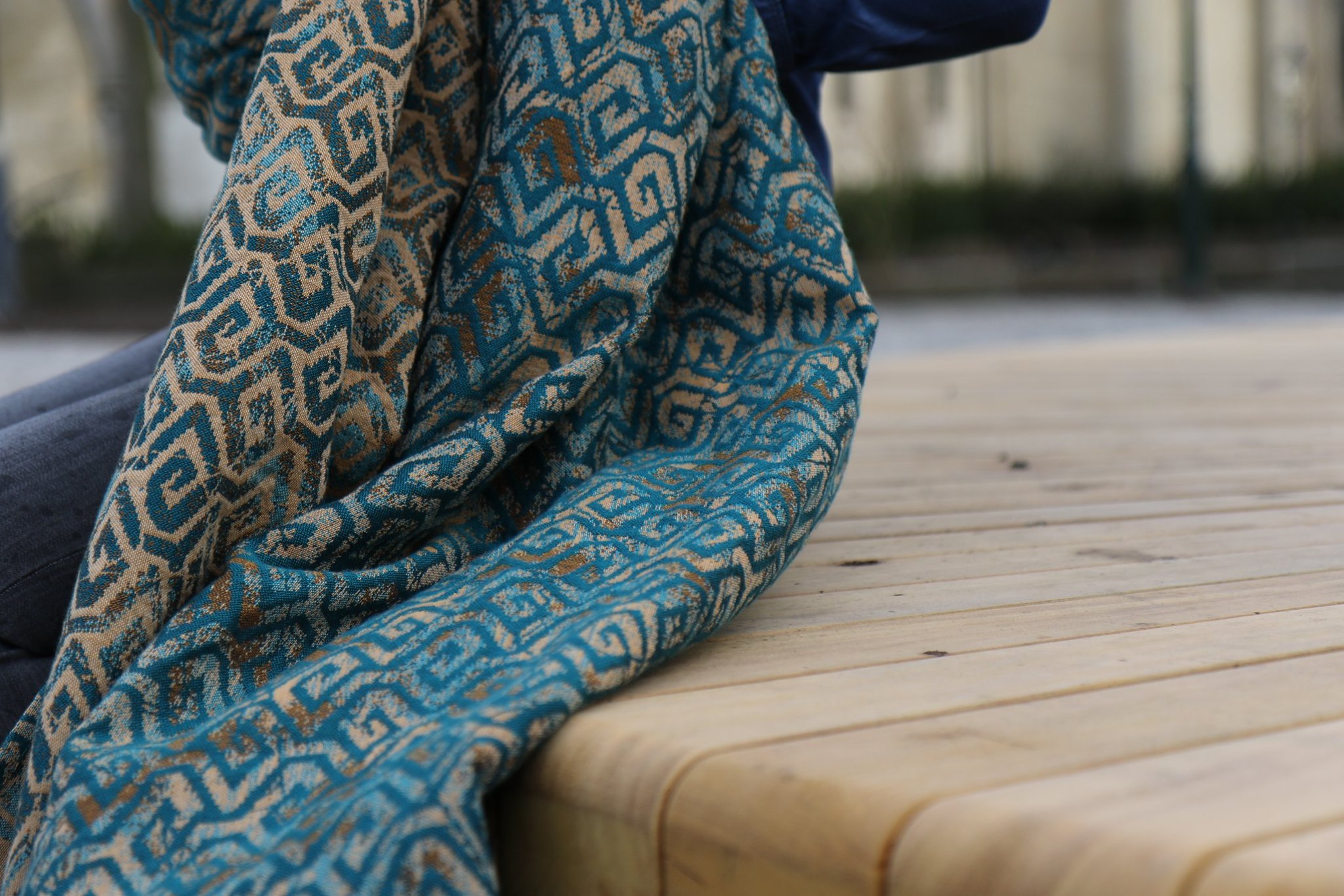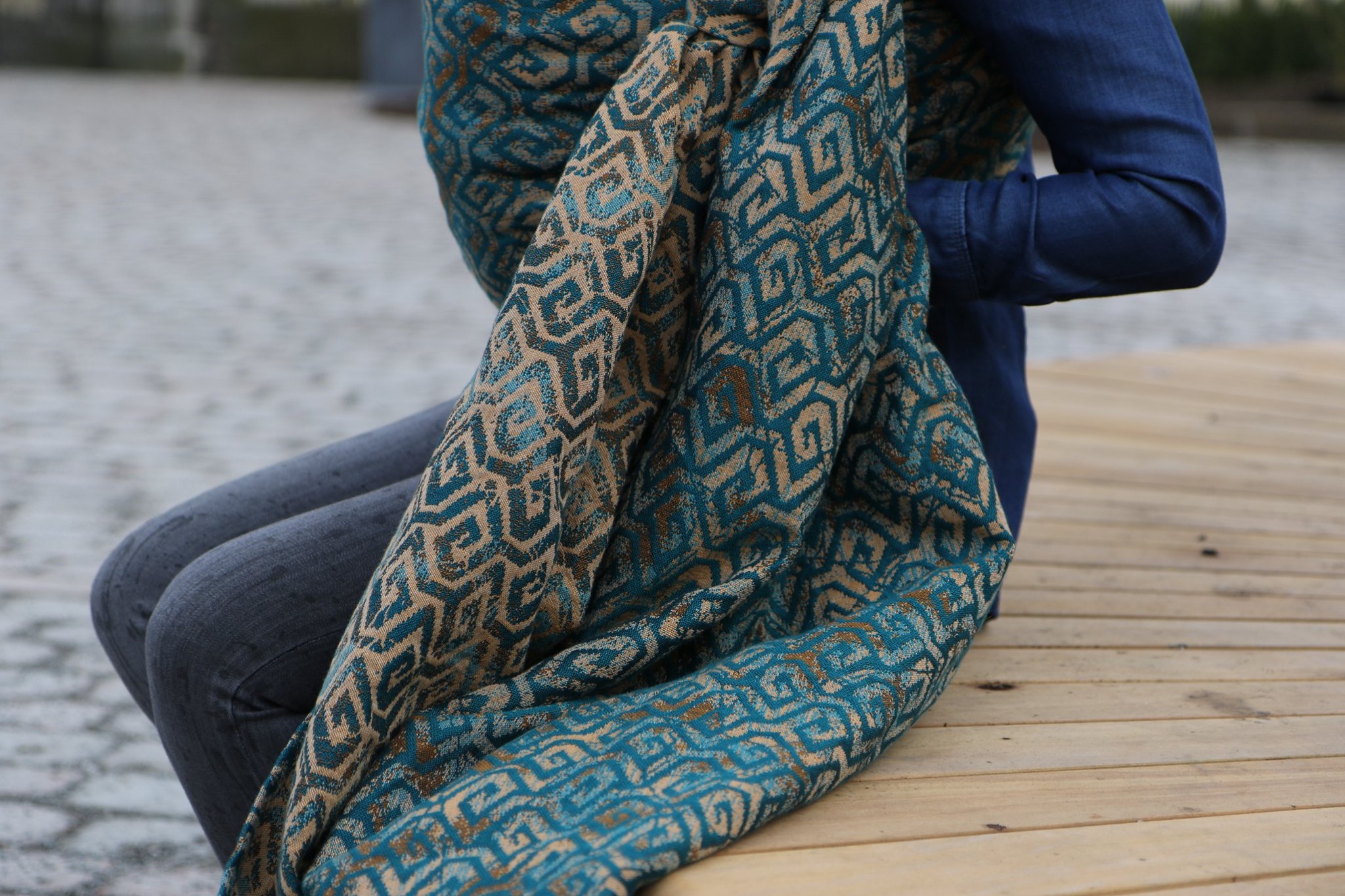 En ljuvligt mjuk sjal som samtidigt är stark med sin materialblandning av bomull och seacell. Nyanserna i sjalen går i ockra och blågrönt. Den har en fin glans och sjalas lätt med fint glid. Den kräver lite inbrytning innan den blir helt mjuk, men blir redan mjukare efter en första tvätt. Den fungerar från nyfödd, men passar även bra för större barn. Tyget känns lätt i handen, passar alla erfarenhetsnivåer.