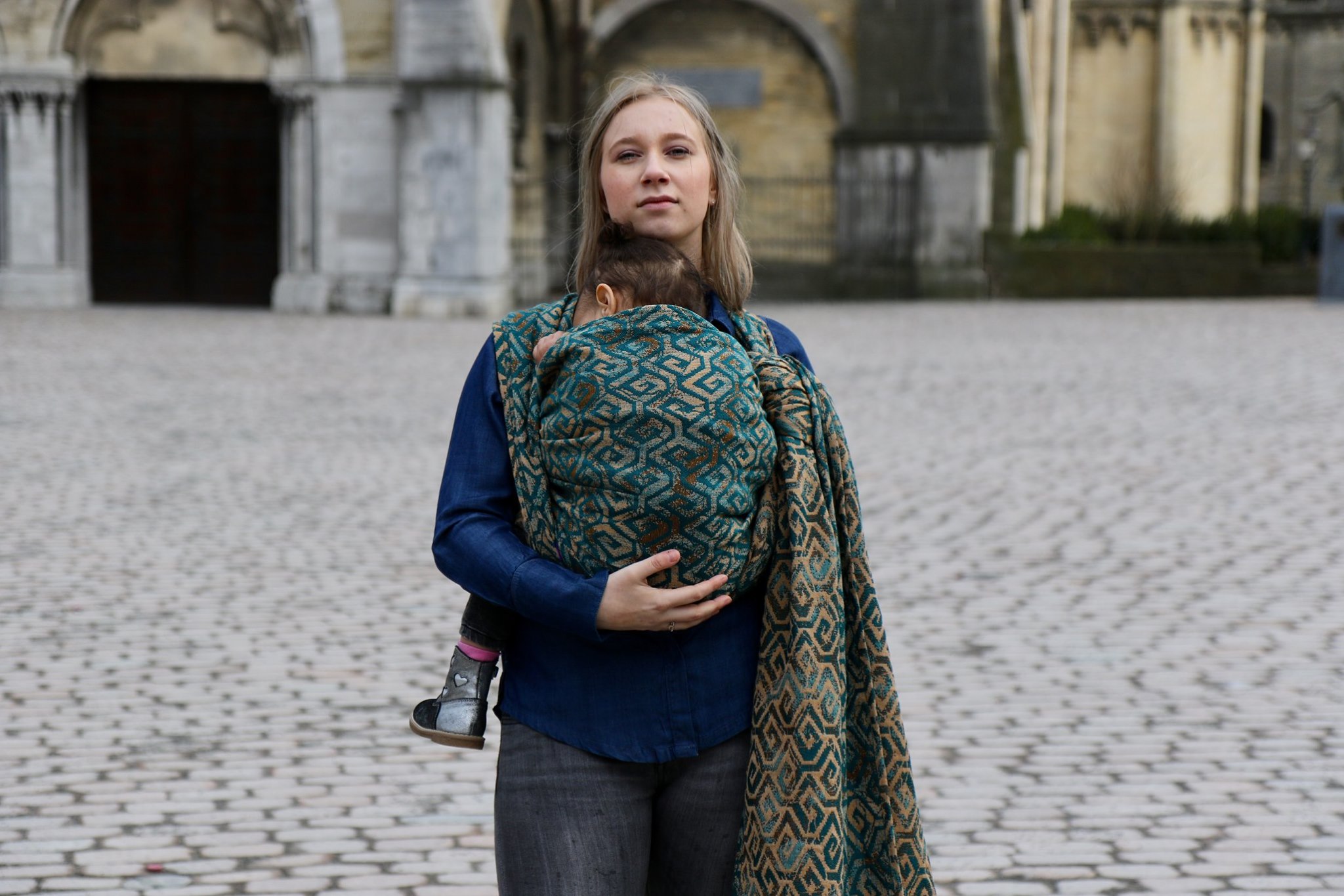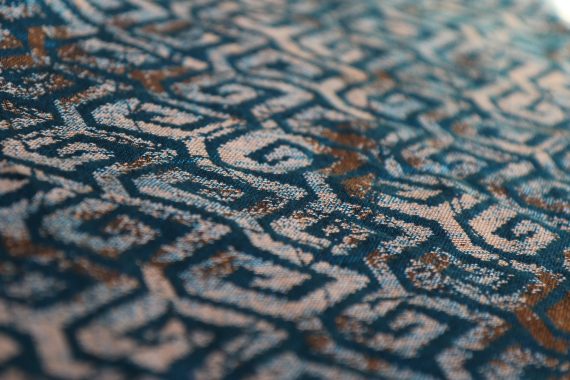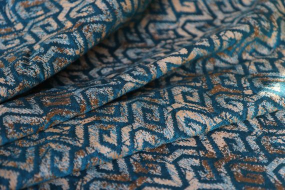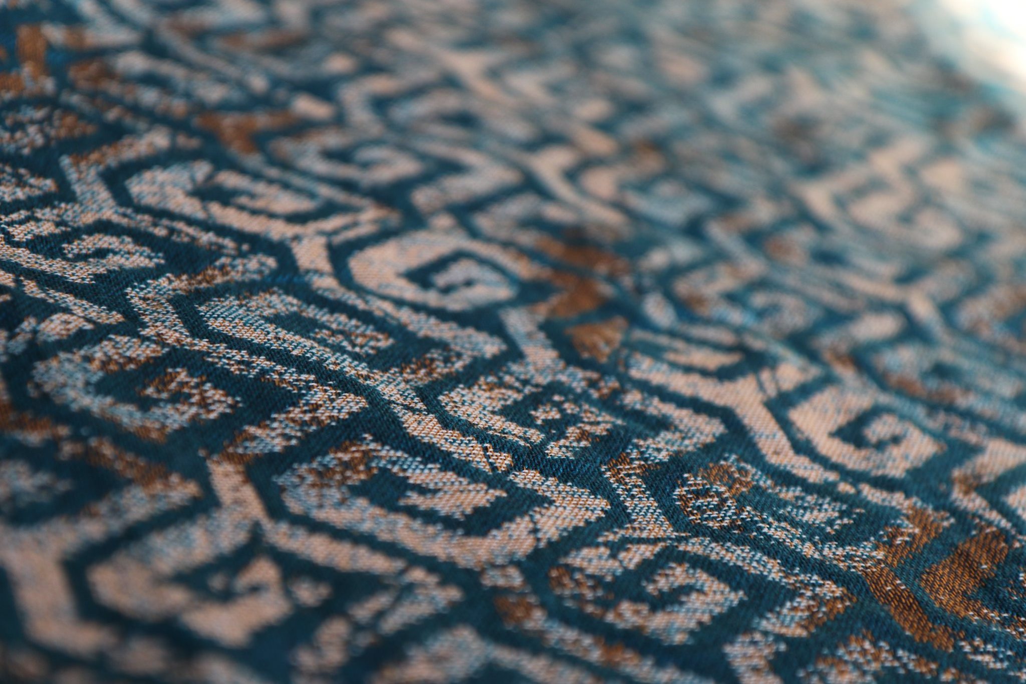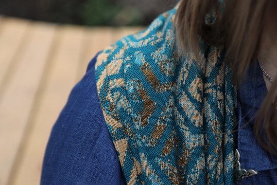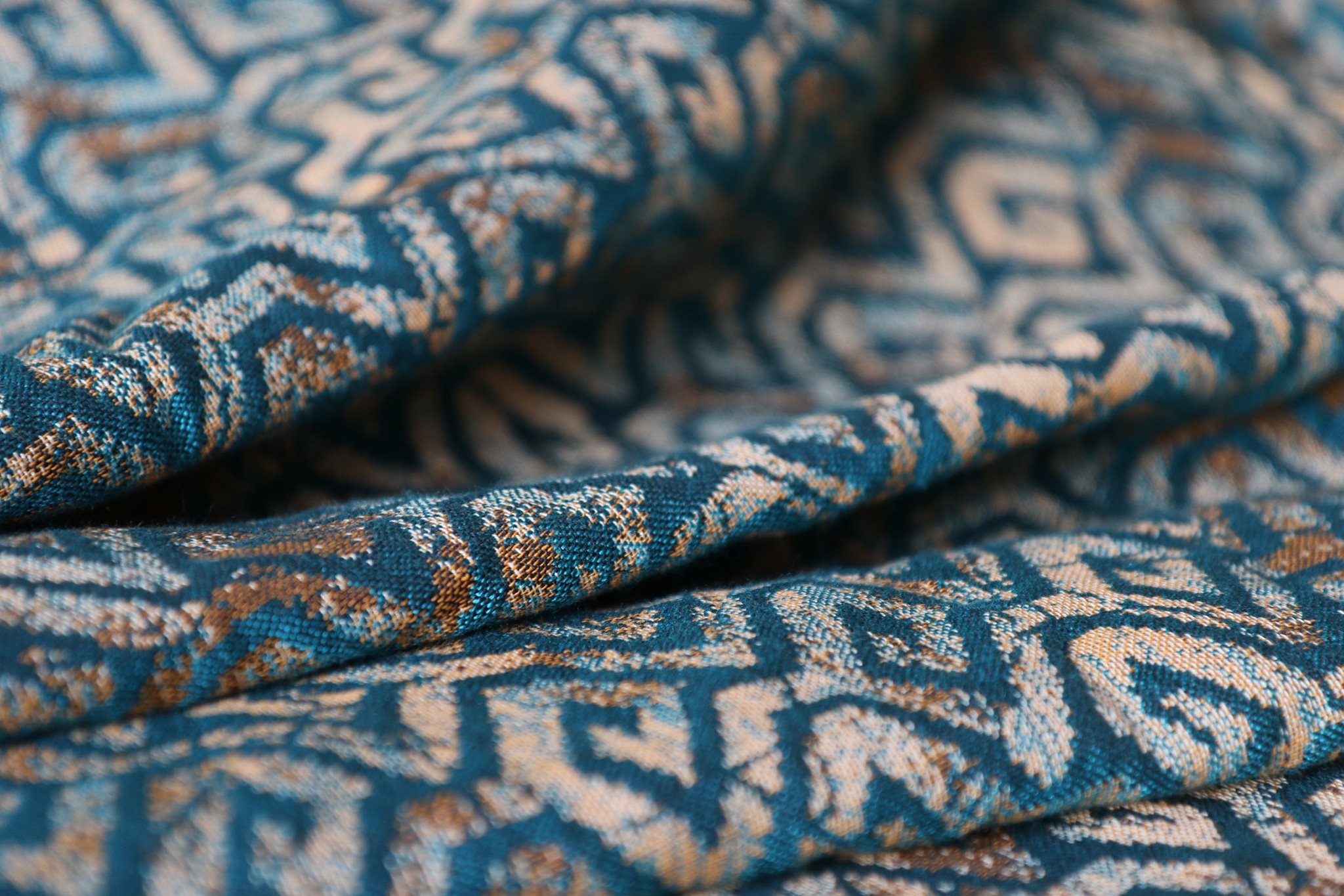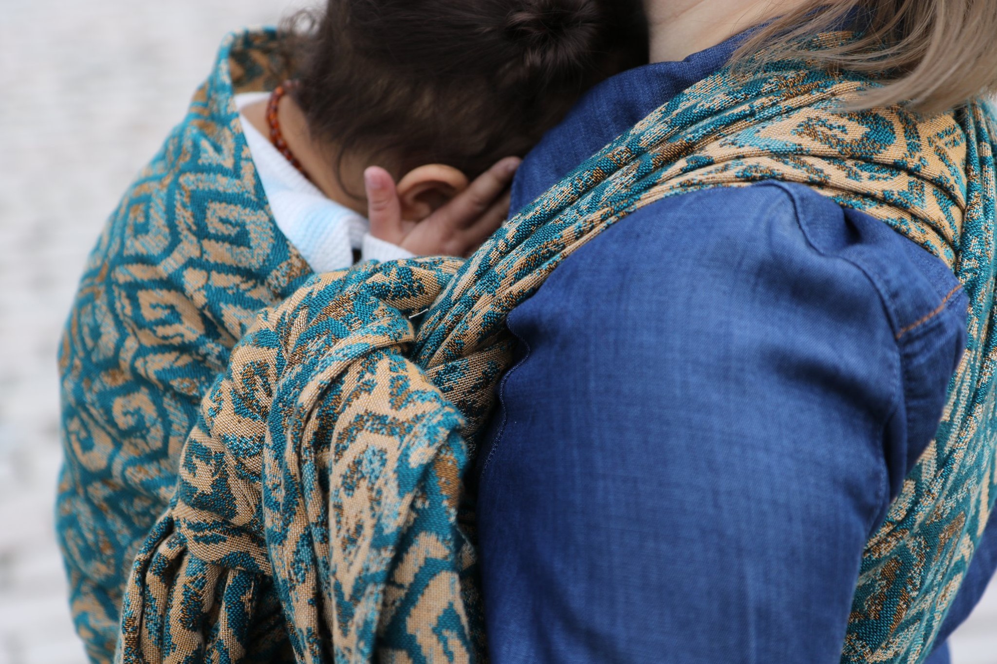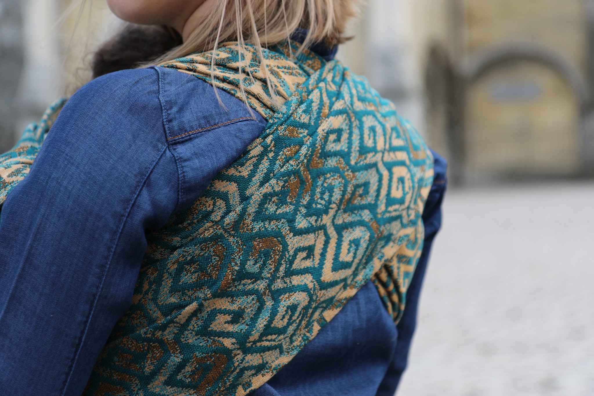 En ljuvligt mjuk sjal som samtidigt är stark med sin materialblandning av bomull och seacell. Nyanserna i sjalen går i ockra och blågrönt. Den har en fin glans och sjalas lätt med fint glid. Den kräver lite inbrytning innan den blir helt mjuk, men blir redan mjukare efter en första tvätt. Den fungerar från nyfödd, men passar även bra för större barn. Tyget känns lätt i handen, passar alla erfarenhetsnivåer.